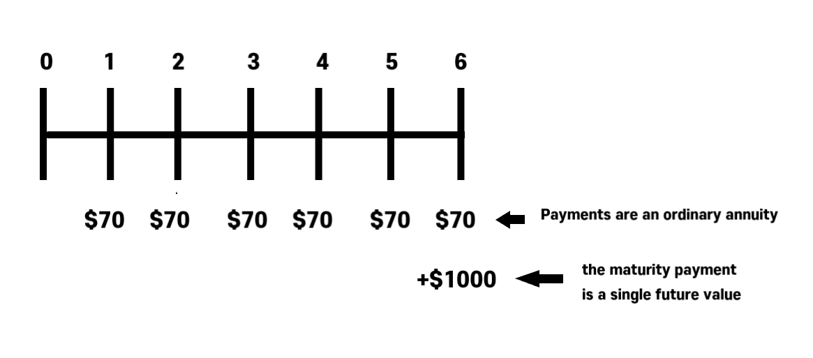 * 매년 말 액면가의 7%의 쿠폰이자(70 euros)를 지급하는 액면가 1,000유로 어치의 채권(만기 6년 짜리)